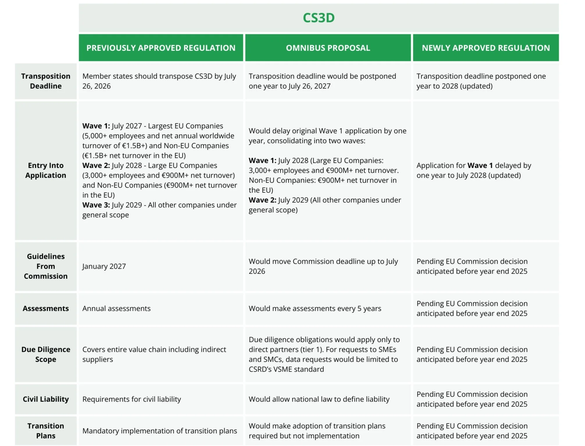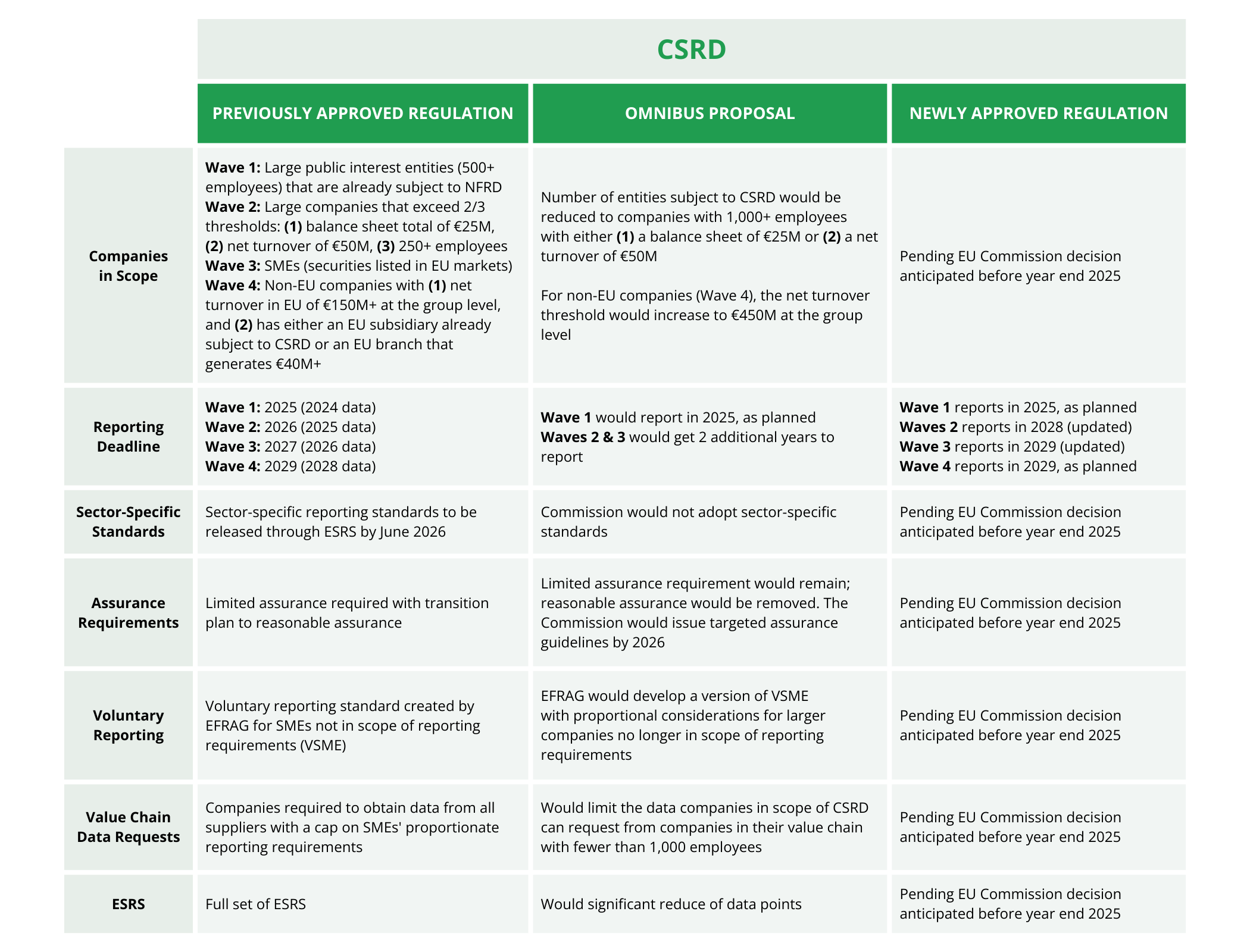 Below, we outline the core elements of CSRD, CS3D, and EU Taxonomy under current regulations and how they would change if the rest of the EU Omnibus proposal is adopted as drafted.