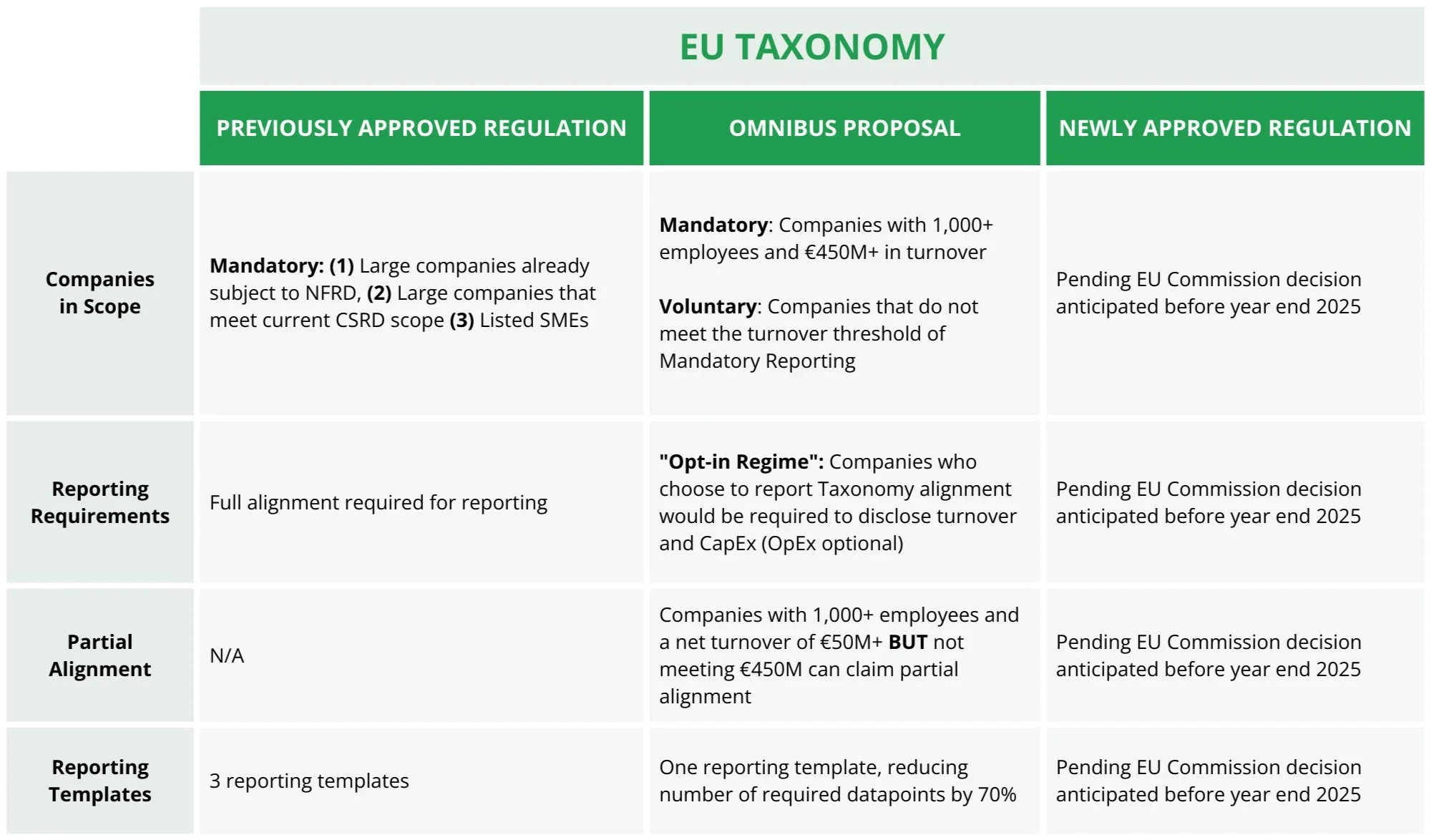 Voluntary reporting would become a key feature under a new “Opt-in Regime,” where reporting is only required if a company claims its activities qualify as sustainable (either partially or fully) under the EU Taxonomy regulation. If no claims are made, no reporting is required, regardless of size.