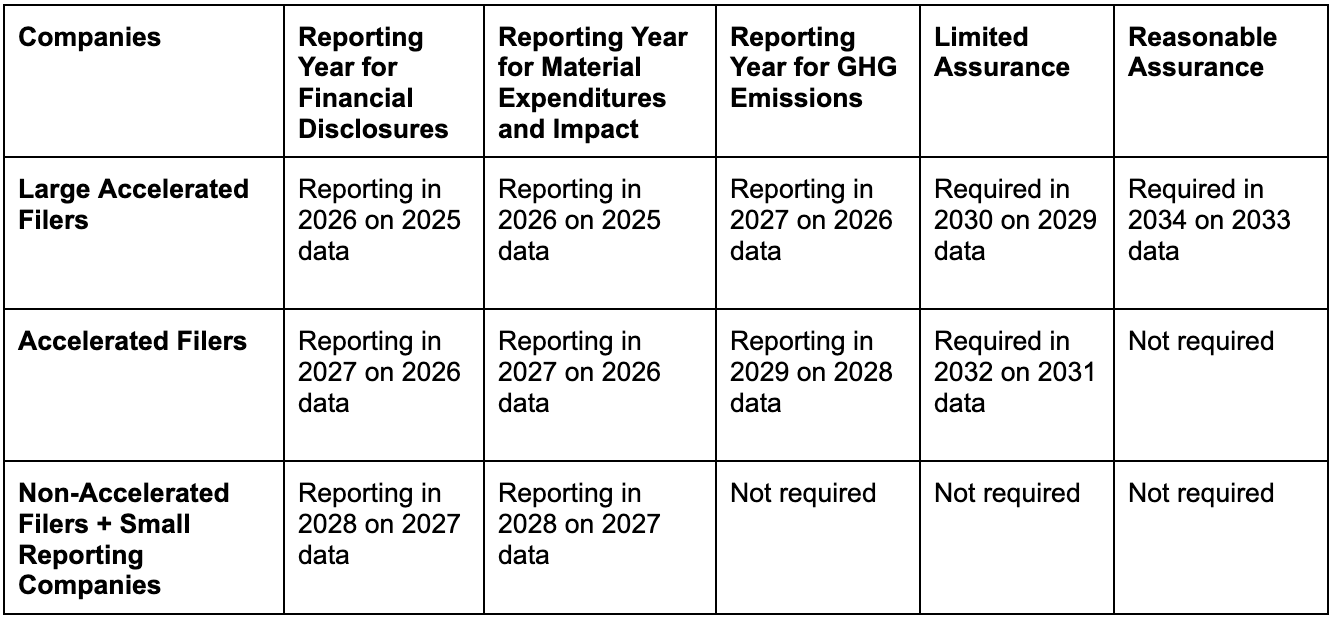 The disclosures related to greenhouse gas (GHG) emissions have the latest deadline, with requirements for both Scope 1 and Scope 2 emissions, as well as later phased-in assurance requirements: